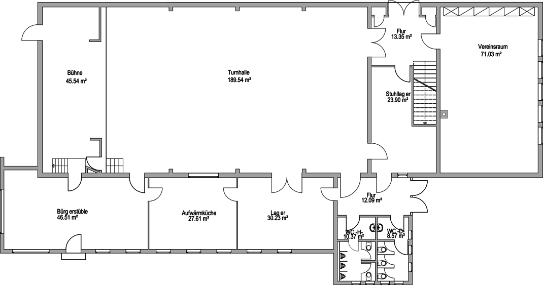 - Nur die Erlenhalle 188 m² mit oder ohne Bühnenelemente