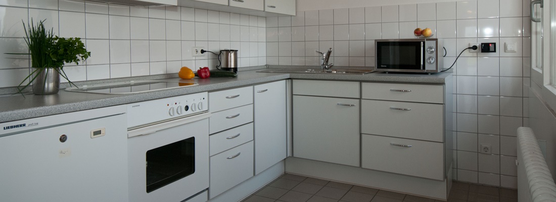 mit Cerankochfeld, Mikrowelle, Kühlschrank und Nespresso Kaffeemaschine.