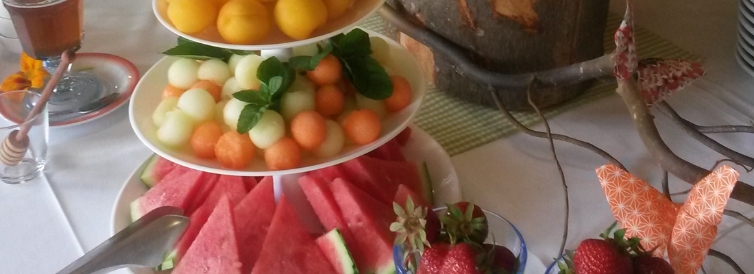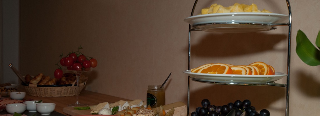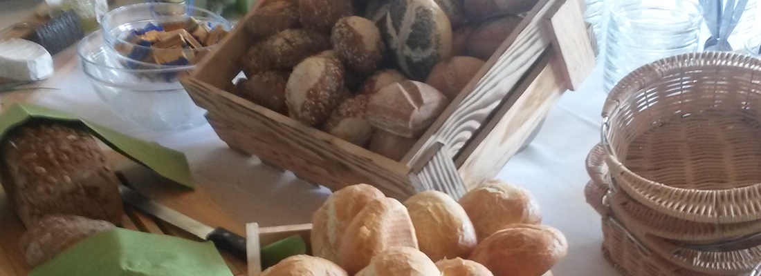verschiedene Kaffee und Teespezialitäten, Säfte, selbstgemachte Marmeladen, Honig vom Imker, ofenfrische Brötchen, Müsliauswahl vom Mühlenladen, frisches Obst, verschiedene Wurstsorten, Weich- und Hartkäse und weitere Leckereien aus der Region.